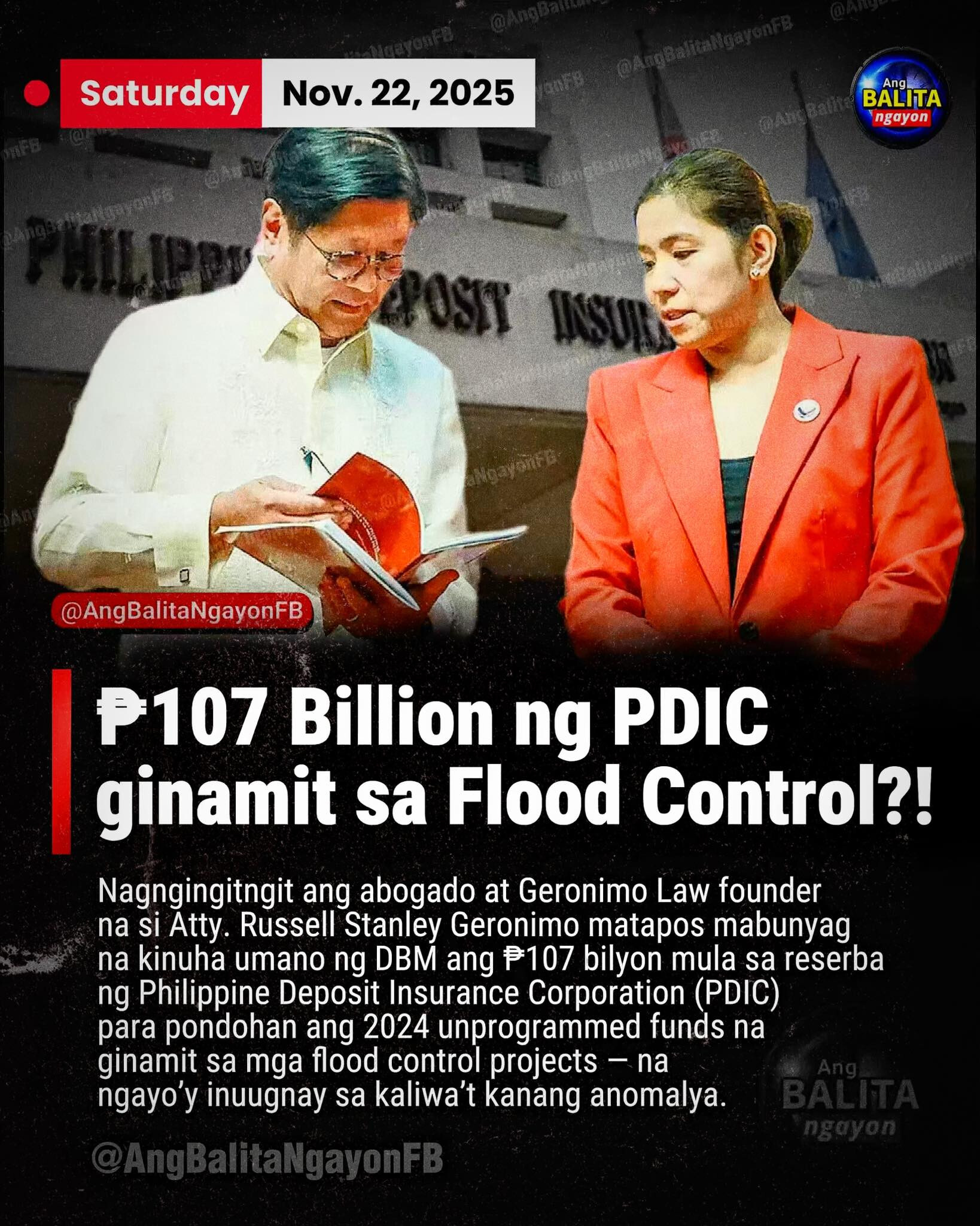 Tila nagngingitngit sa galit ang abogado at Geronimo Law founder na si Russell Stanley Geronimo matapos mabunyag na kinuha umano ng Department of Budget and Management (DBM) ang ₱107 bilyon mula sa reserba ng Philippine Deposit Insurance Corporation (PDIC) para pondohan ang 2024 unprogrammed funds na ginamit sa mga flood control projects — na ngayo’y inuugnay sa kaliwa’t kanang anomalya.