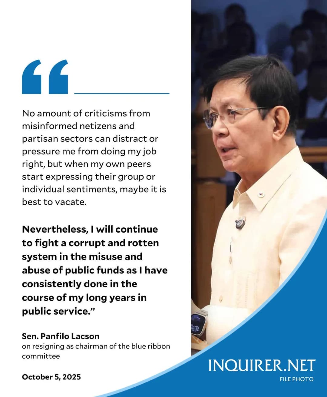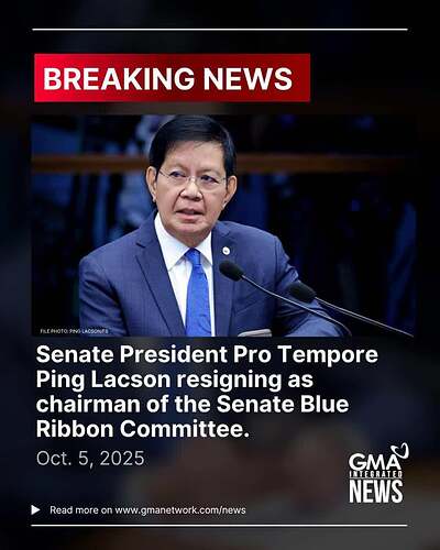 BREAKING: Senate President Pro Tempore Ping Lacson is resigning as chairman of the Senate Blue Ribbon Committee after some senators aired their disappointment over the investigation into anomalous flood control projects.