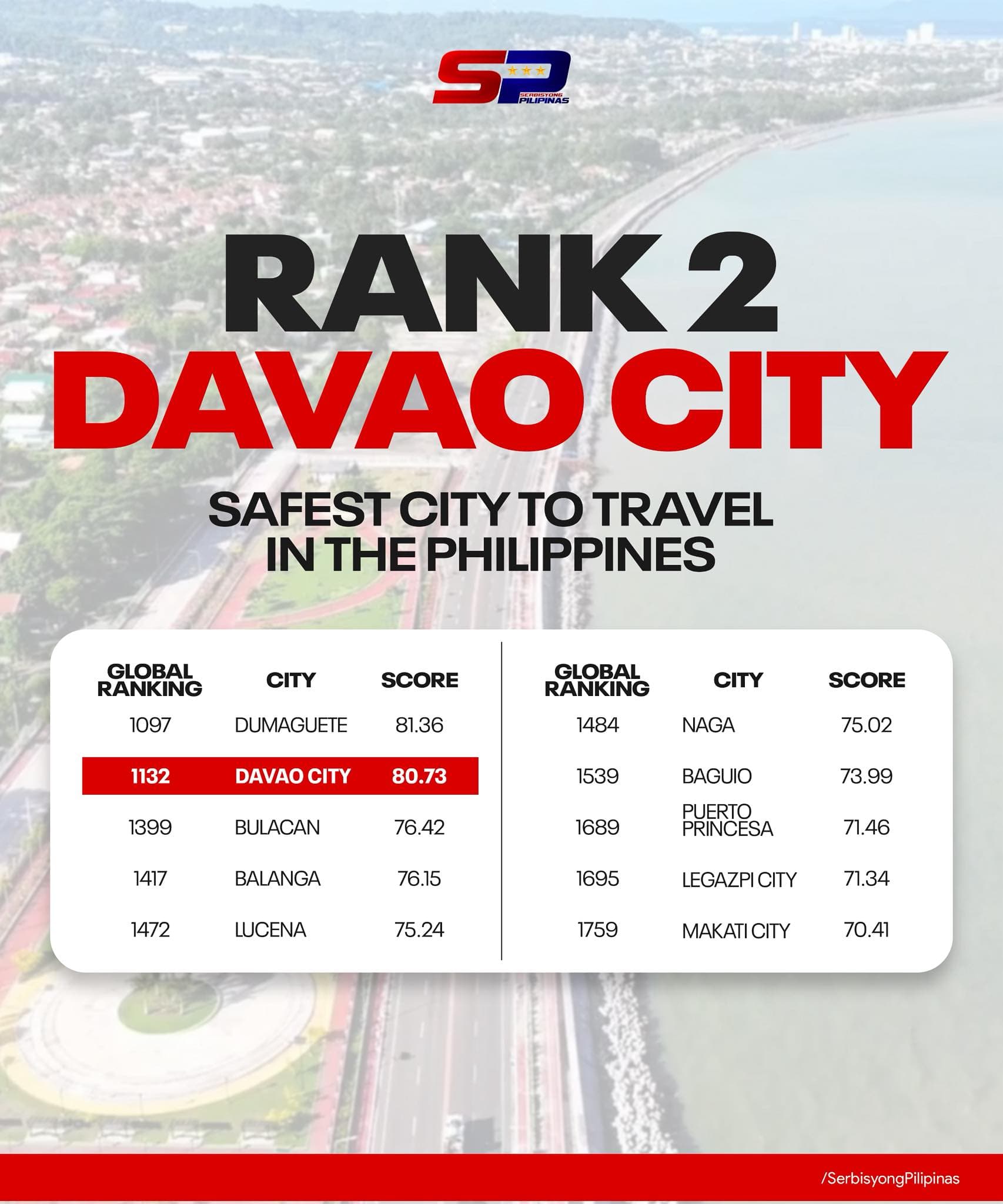 Itinanghal ang Davao City bilang ikalawa sa “Safest Cities in the Philippines for Travelers”, batay sa inilabas na ranking ng World Travel Index ngayong 2025.