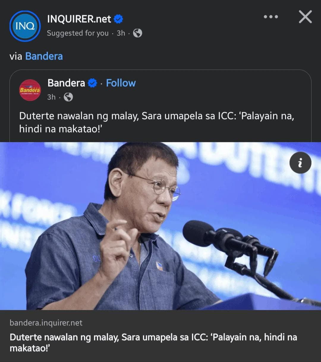 Imagine a person charged with crimes against humanity asking for humane treatment. Luh! Bakit noong sunod-sunod ang victims ng EJK na obvious naman na hindi makatao ay wala syang apela sa ama nya? Hahahahaha. Inday, Inday.. nakakatawa ka.