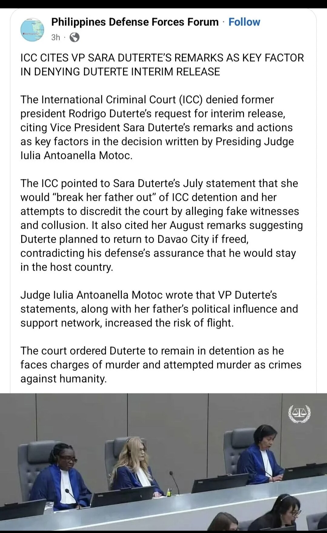 and collusion. It also cited her August remarks suggesting Duterte planned to return to Davao City if freed contradicting his defense’s assurance that he would stay in the host country.