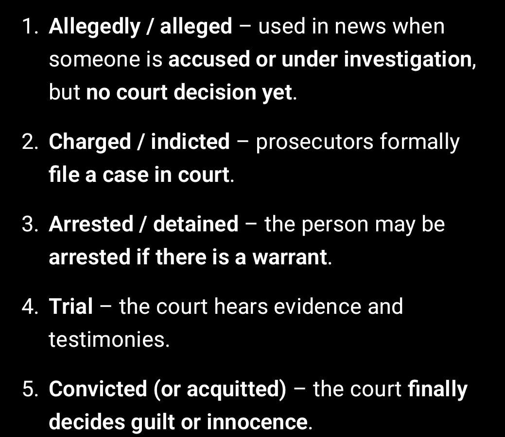 Example: si Quiboloy. Years din bago sya naaresto. Sa mga balita noon ginagamit yung “allegedly” sa kanya dahil may mga complainants, testimonies, and ongoing investigation pa lang. Nung nagkaroon na ng kaso at warrant, saka siya naaresto at kinasuhan.