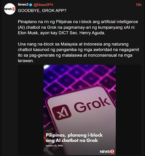 (January 15, 2026) – The Philippines will block Grok amid concerns that the