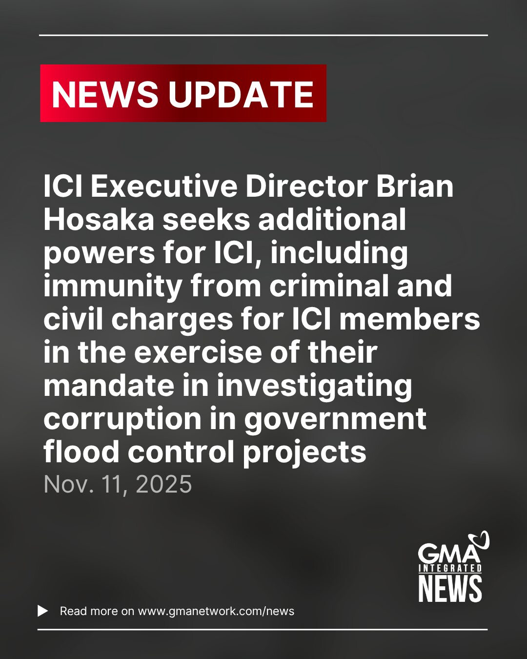 Independent Commission for Infrastructure Executive Director Brian Hosaka seeks additional powers for ICI, including immunity from criminal and civil charges for ICI members in the exercise of their mandate in investigating corruption in government flood control projects. | via Llanesca Panti/GMA Integrated News