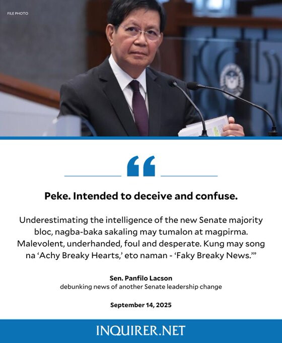 ‘PEKE’ Sen. Panfilo “Ping” Lacson debunks reports claiming that another change in the Senate leadership is underway, with Senate Minority Leader Alan Peter Cayetano securing numbers to be the chamber’s president. Lacson now heads the Senate blue ribbon committee.