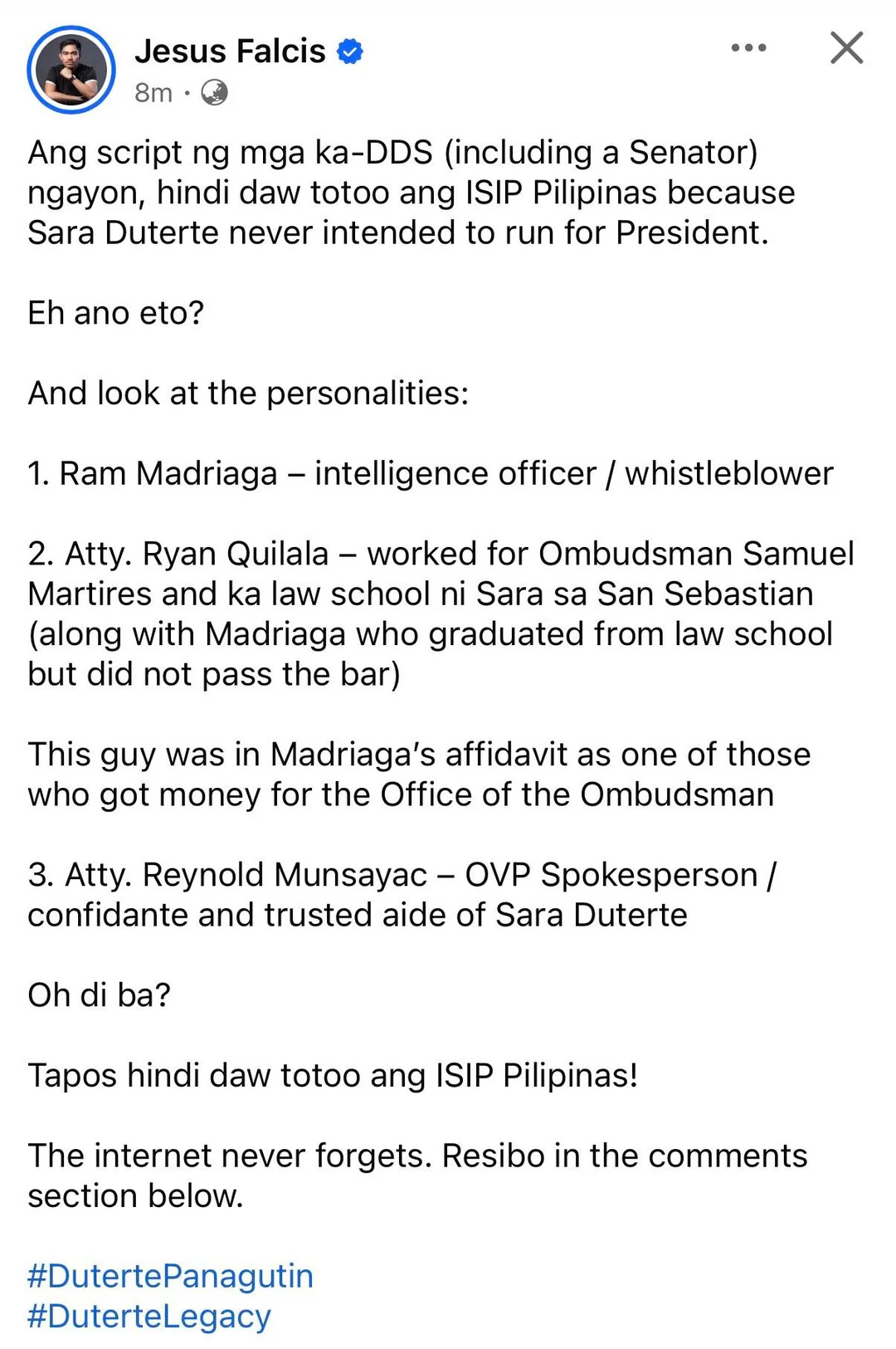 The DDS claim that the new allegations against Sara Duterte aren’t true, even though the personalities involved (including the whistleblower) ALL worked for her or were associated with her
