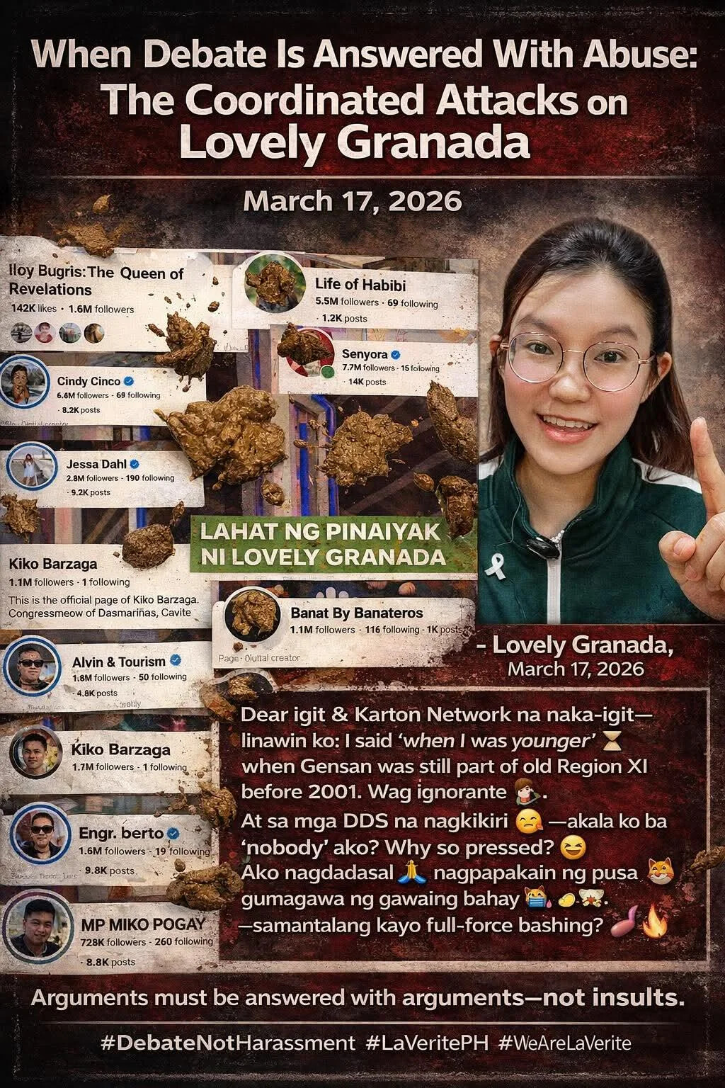 Screenshots circulating across platforms show several high-following pages posting near-synchronized content targeting Granada. Notably, these posts did not meaningfully address her arguments or the substance of her challenge. Instead, they focused on personal attacks—appearance, background, and unverified claims—revealing a clear shift from discourse to character assault.