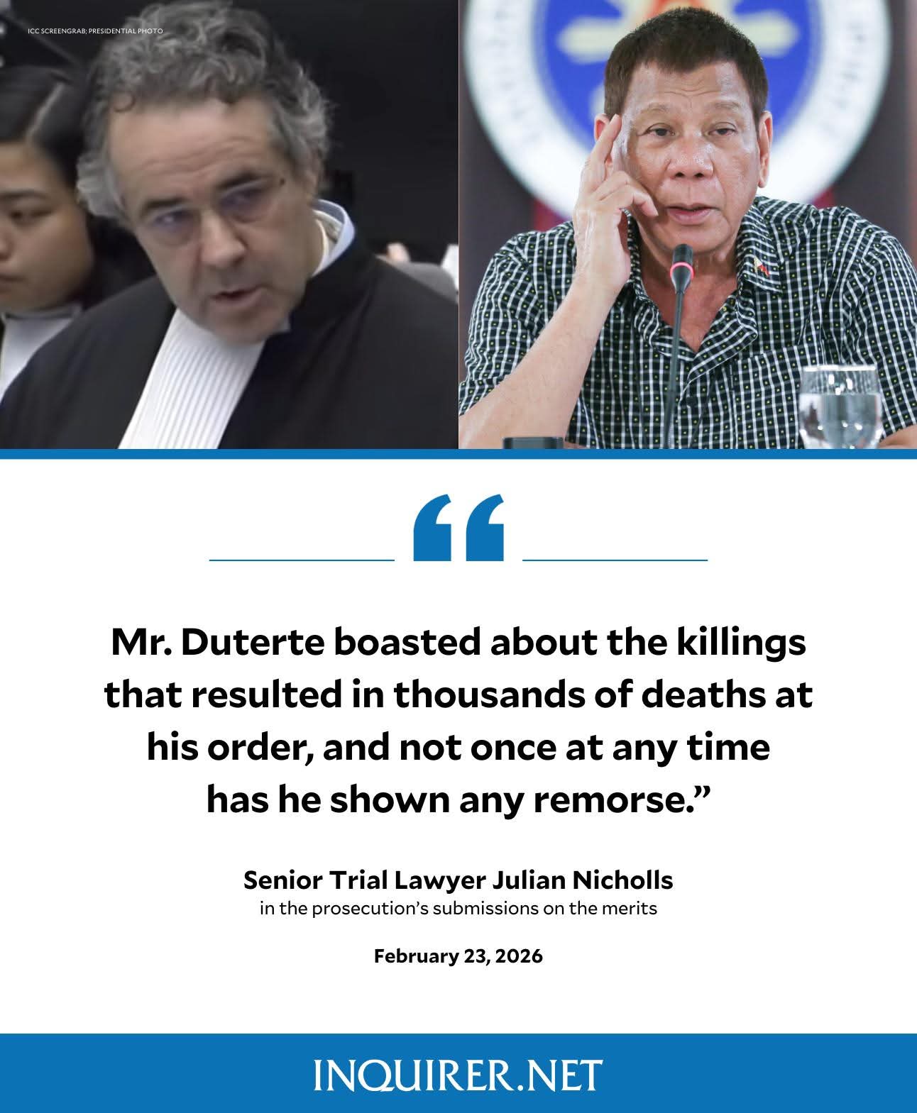 Senior Trial Lawyer Julian Nicholls says former President Rodrigo Duterte openly boasted about the killings that led to thousands of deaths under his orders, without ever expressing remorse.